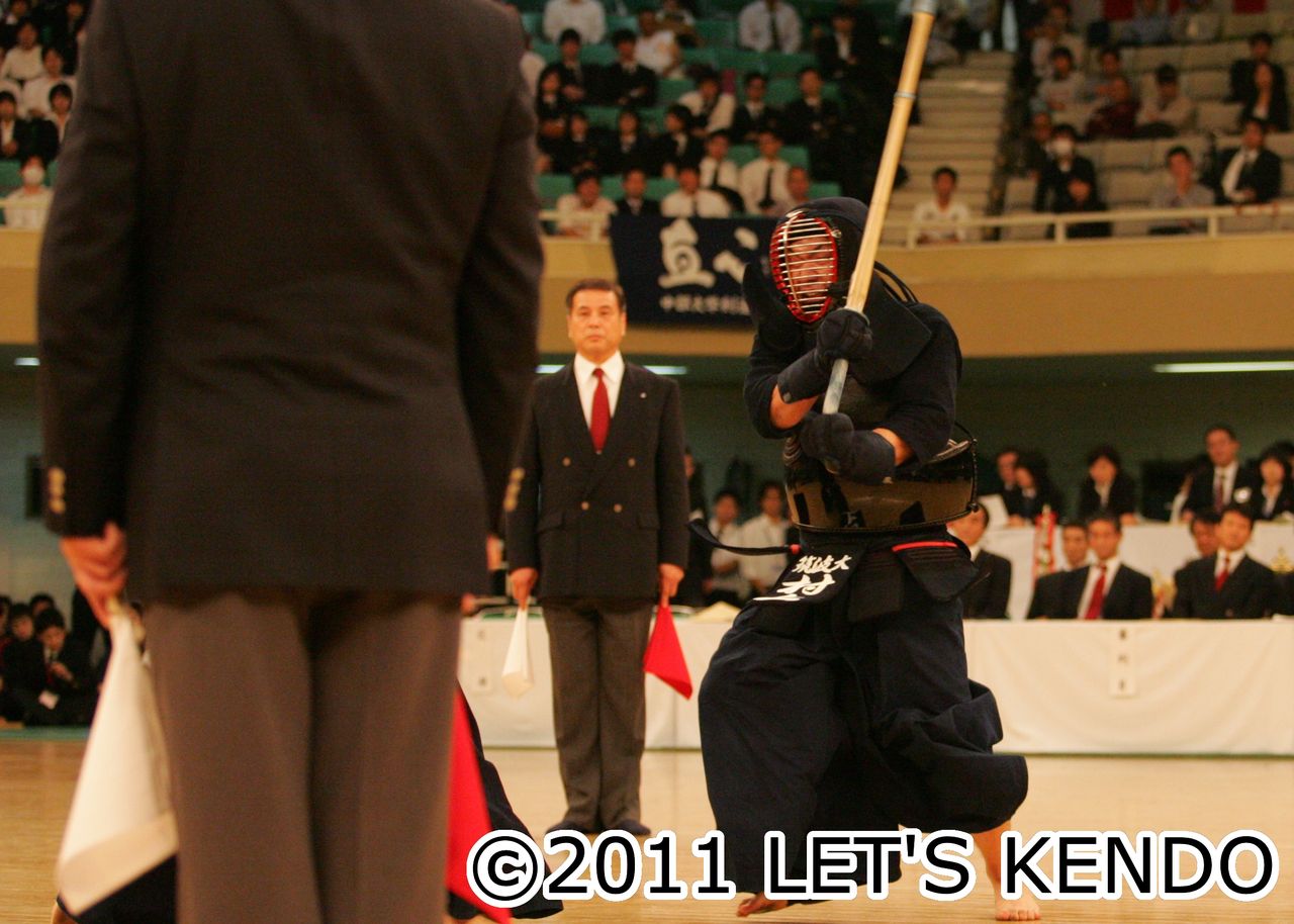 もう一試合、大体大対国士舘は、大将まで2−2、本数で大体が1本リード。大将戦、準々決勝で代表戦を制した国士舘・石田でしたが、この試合ではなかなか一本が奪えず、引き分け。大体大が決勝へ進出しました。上位に進出する大学の大将戦で、どちらかがリードし、守り気味に戦われたら、なかなか一本取れるものではないですね。難しいですね〜 私は、試合にでることも、ましてや大将戦を戦ったこともないのです。無理だな〜 大将戦。実力もなければ、責任感ないかならな〜