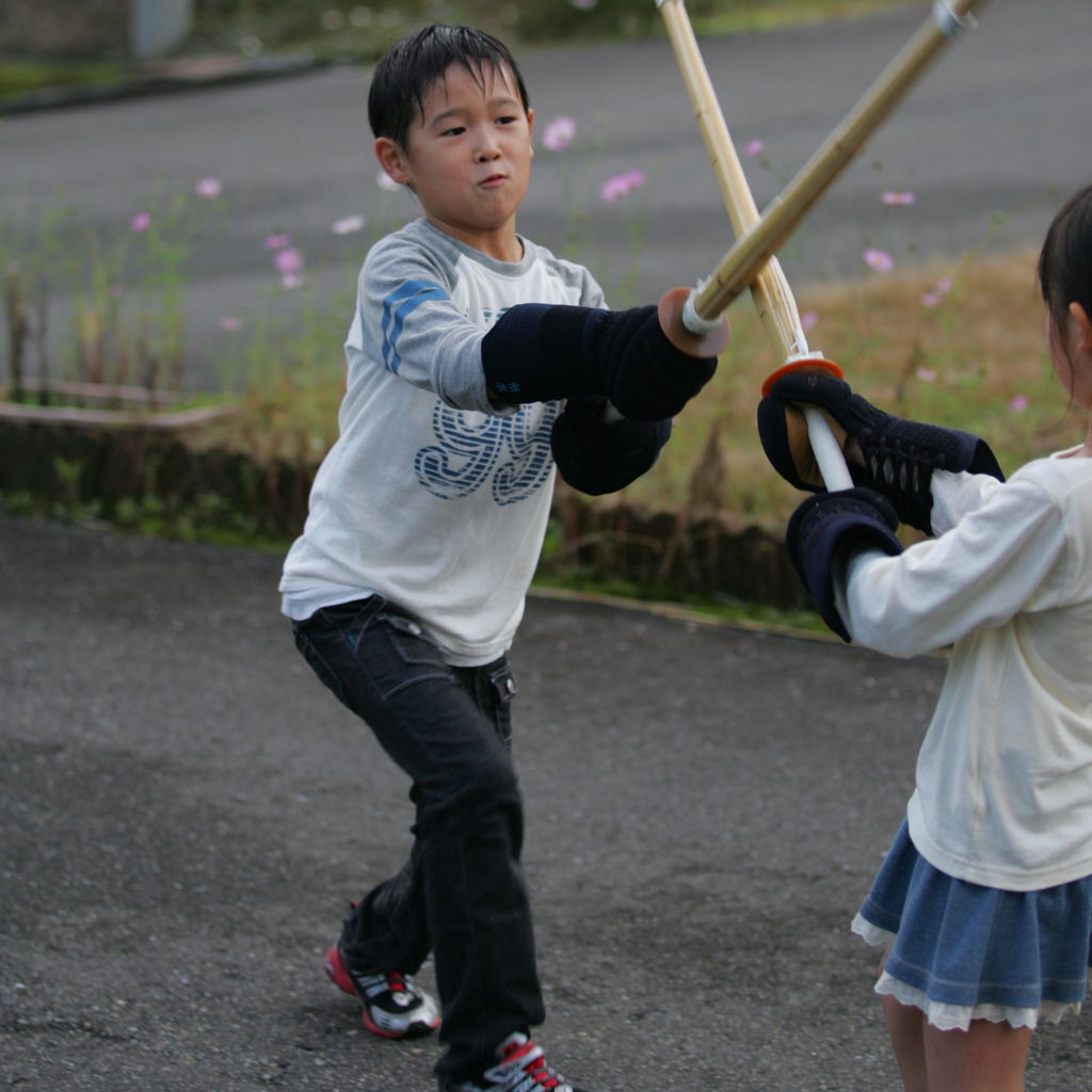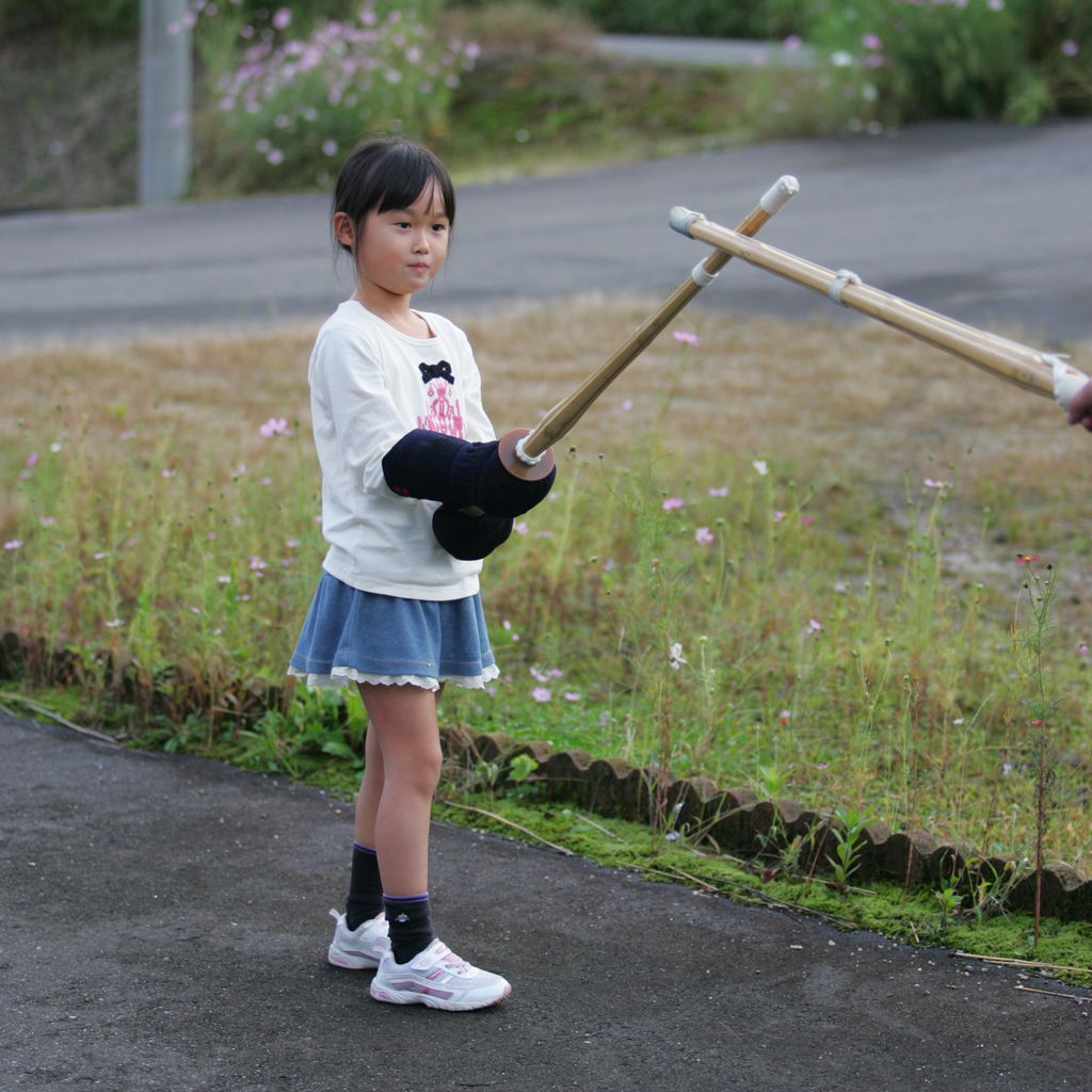そして、「教えて!」と言うので、先輩の不安そうな視線を感じながら、熱血指導。始めは「庭は恥ずかしいから家の中でやろうよ」なんて言っていたのですが、「庭でデカイ声を出さないと教えてあげない!」と言い、強制的に庭で稽古。始めは声も打ちも遠慮していましたが、最終的には声も大きく出て、思いっきり打てるようになり、また、ビビらず打ち込んで来たので、合格!!